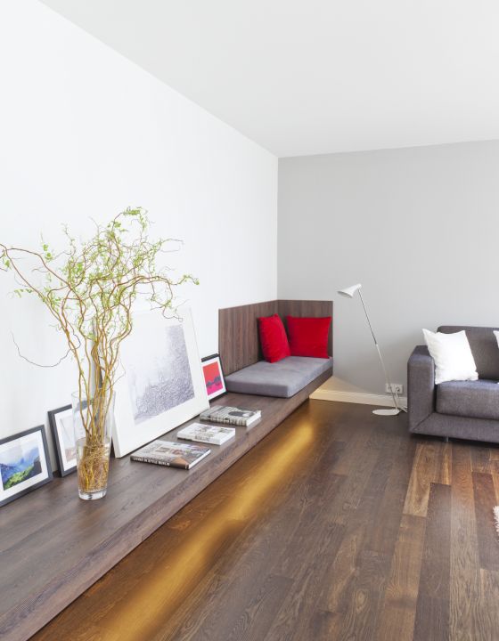 Das Apartment bestand zunächst aus Wohnzimmer, Küche, Badezimmer, Flur und einem Schlafzimmer. Zwei Wände wurden entfernt und die Küche wurde lediglich mit einem Bartresen vom restlichen Raum abgetrennt. Die gesamte Wohnung ist farblich in grau in unterschiedlichem Abstufungen gehalten. Der Wohnraum wird durch eine lange Bank aus dunklem Holz, die gleichzeitig als Ablage und Sitzgelegenheit dient, und eine Big Size-Leuchte mit 50cm Durchmesser von Lightyears geprägt. Die weiße Küche ist mit pflaumefarbenen Fliesen gestaltet.