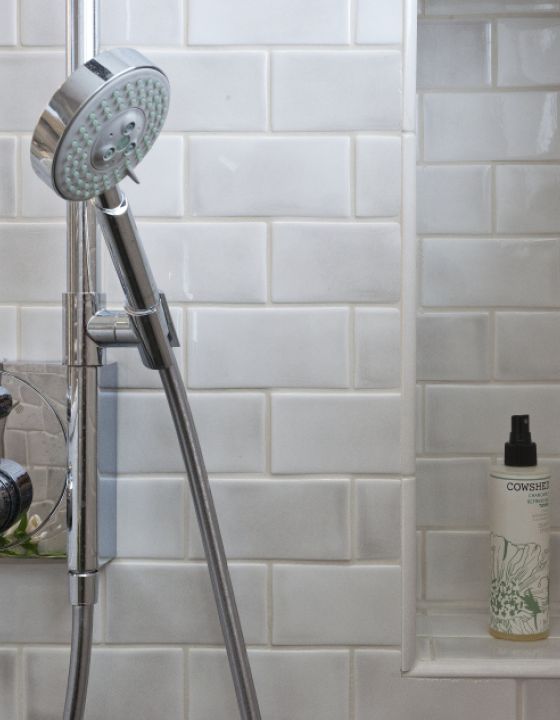Das Bad wurde ebenfalls komplett renoviert: Die Badewanne wurde entfernt und durch eine geräumige Dusche mit Ablagebank ersetzt. Der Waschtisch ist individuell vom Tischler angefertigt und bietet viel Stauraum. Die Facettenfliesen an der Wand changieren in leichtem grau.