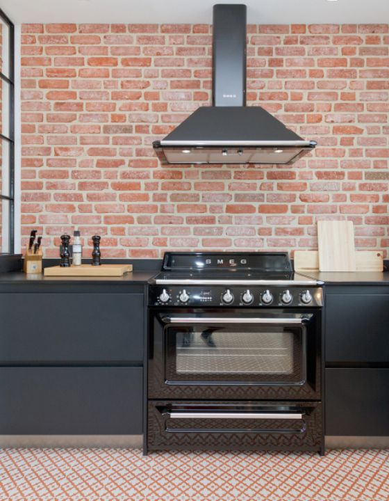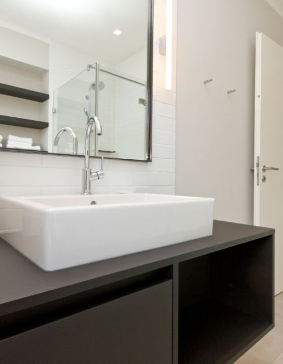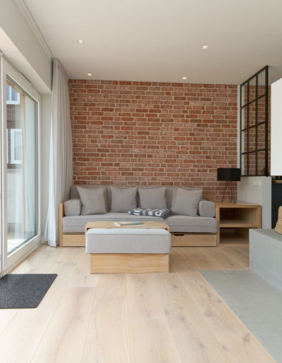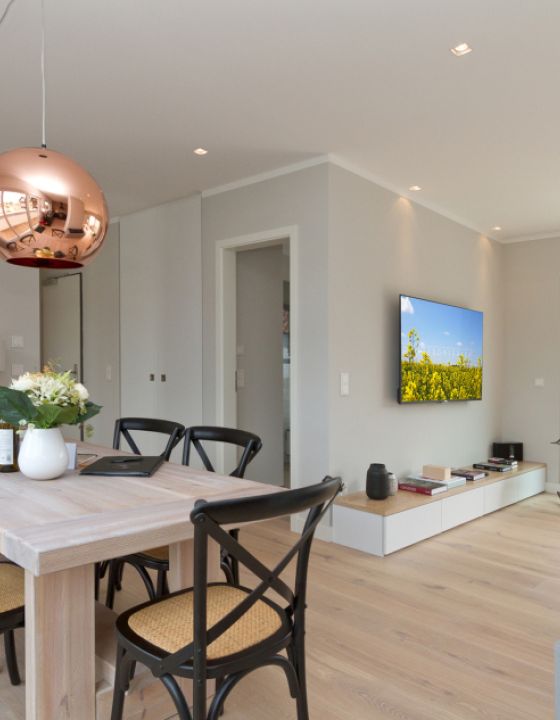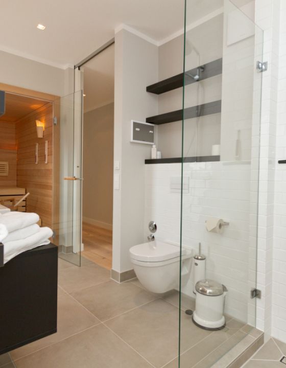 Eine Penthouse-Wohnung im Loft Style verbirgt sich hinter der modernen Fassade des Neubaus in Ahlbeck. Der Wohnbereich vereint gleichfalls Kochen, Essen und Wohnen miteinander. Die Küche ist in mattem Schwarz gehalten und wurde mit Geräten in Retro-Optik ausgestattet. Getrennt werden Küche und Wohnbereich durch ein Fenster in Industrieoptik und vom Wohnraum geteilt. Der rustikale Tisch "Seawashed" ist aus Tannenholz gefertigt. Die Leuchte "Copper" von Tom Dixon bildet hierzu einen urbanen Kontrast. Zentrum des Raumes ist der 3-seitig verglaste Kamin und die Bank aus Beton. Ein Highlight ist ebenfalls die rückwärtige Backsteinwand, die der Wohnung gleichfalls Wärme und Rustikalität verleiht. Das Badezimmer ist durch die kleinen Sauna ein Mini-Spa geworden. Hier trifft Fliese in Betonoptik auf weiße Metrofliesen. Akzente werden durch die schwarzen Regale und Unterschränke gesetzt.