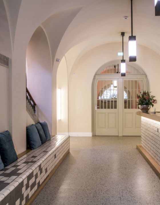 2016 wurde das Gebäude einer neuen Nutzung als Hotel, Schwimmbad und Veranstaltungsort zugeführt. Unsere Aufgabe war die Neugestaltung der öffentlichen Bereiche des Hotels.