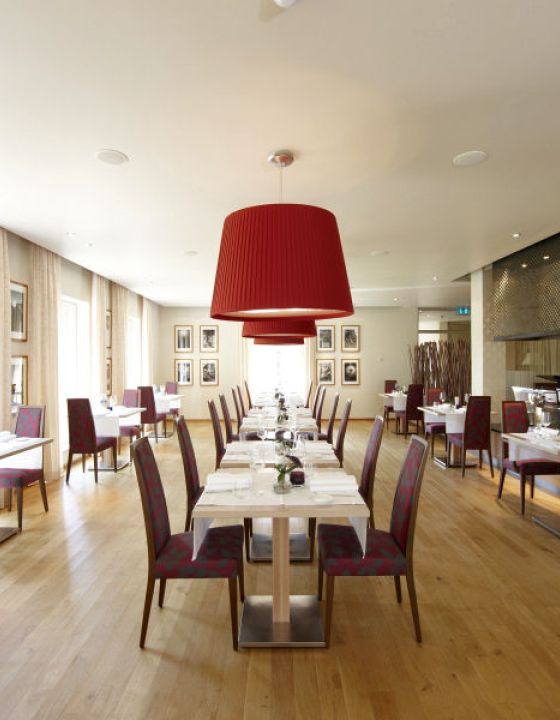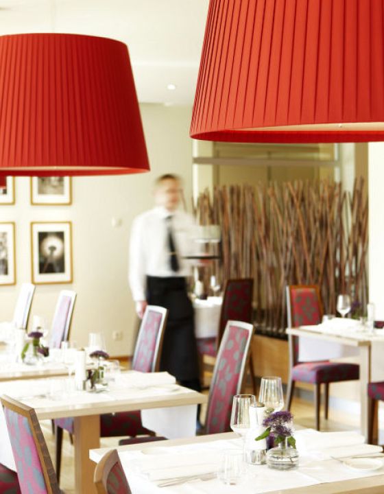 Da das Hotel junge und ältere Gäste ansprechen möchte, haben wir eine klassische gerade Formensprache gewählt. Der Eingangsbereich erhielt einen Schieferboden und einen schnörkellosen Empfangstresen aus gekalkter Eiche. Erster Farbakzent sind die roten Designer-Sessel. Eine Glasscheibe mit aufgedrucktem Schilfmotiv trennt den Eingang vom Bar- und Loungebereich und dem Restaurant. Bar und Lounge erhalten eine moderne Bilderwand mit Motiven aus dem Spreewald, Holzsitzen und stimmungsvoller LED-Beleuchtung.
