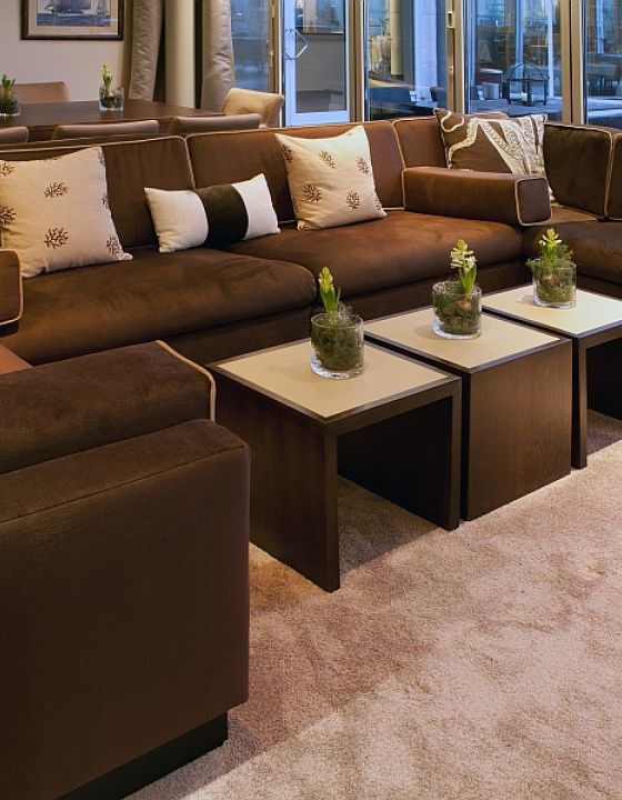 Bei der Umgestaltung des Loungebereiches wurde auf neue „Stofflichkeit" gesetzt. Zwei riesige neue Loungesofas in U-Form laden den Gast zum Verweilen ein.