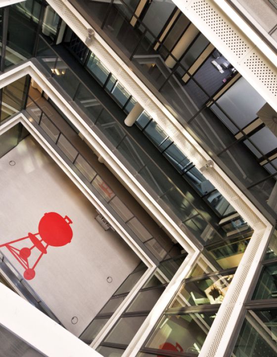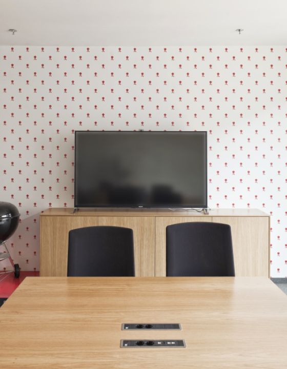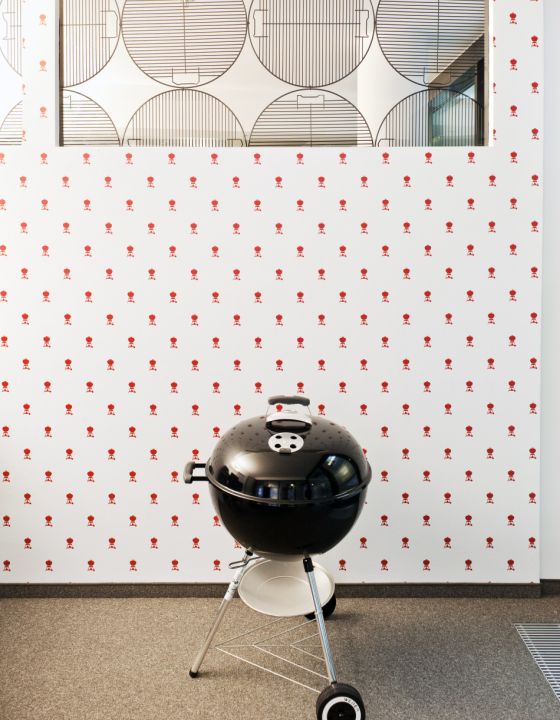 In den Meeting-Räumen sind die Wände mit einer rot-weißen Mustertapete mit dem traditionellen WEBER-KETTE versehen, die eigens für das flächige „Branding" entwickelt wurde. Aus Grillzangen und Grillrosten werden dekorative Wandinstallationen entwickelt.