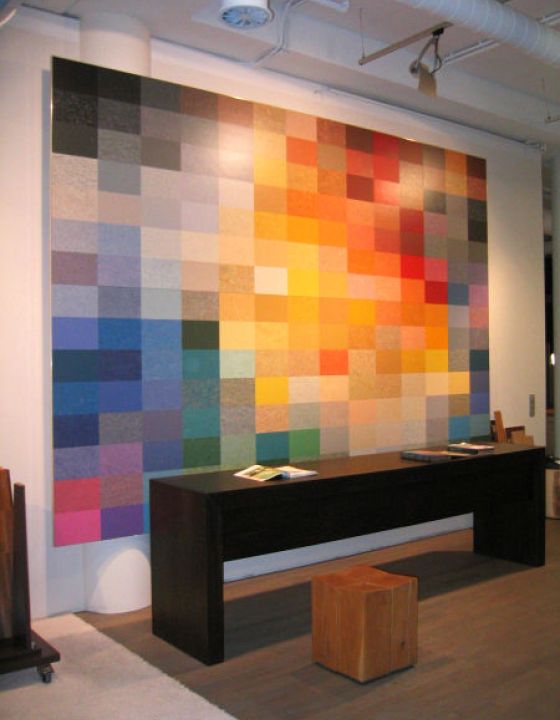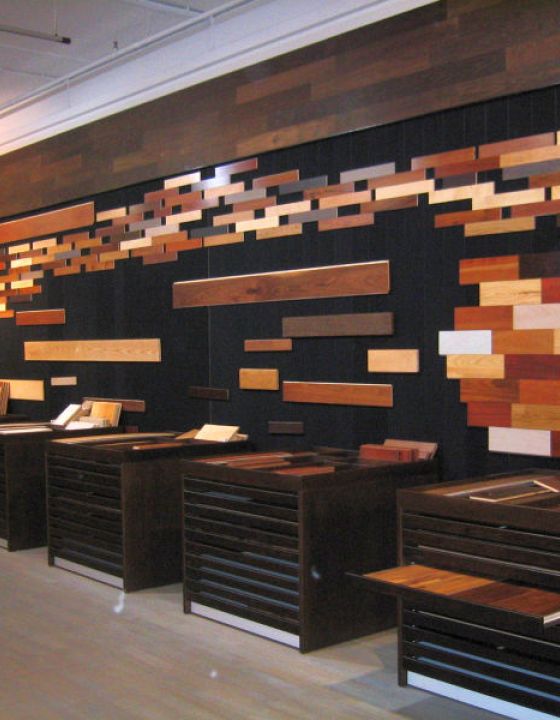 Die Verkaufsschwerpunkte Parkett und Linoleum werden als großflächige Materialwände im Laden dargestellt. Die Parkettmuster sind mit Klettband an der Wand befestigt und können bei Bedarf flexibel abgenommen werden. Die Linoleumwand wirkt wie ein großes Kunstwerk und zeigt Linoleum von seiner schönsten Seite.